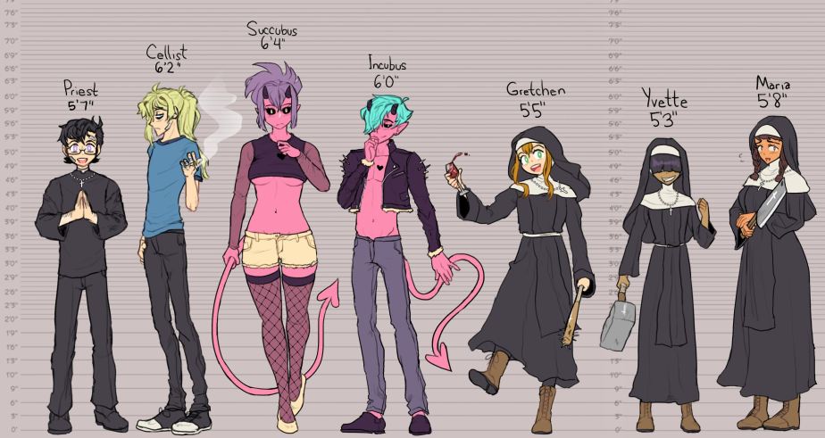 - We haven’t seen a lot of the nuns yet, but I like having Maria be taller than Priest (kind of want to make her 5’9″ or 5’10”) because she’s the most mature out of the three. Yvette is a smol angry banana-woman and Gretchen is pretty average.