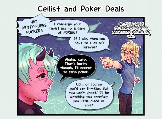 Cellist was the second character I made. I coded him as the “Hot one.” I had a positively dreadful time ironing out his personality and backstory. I kept running into particular personality traits conflicting, I had even made fucking flowcharts for his personality! I filled out one of those dumb 200-questionnaires for him! It was useless!